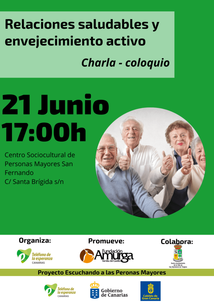 El pasado 21 de junio Teléfono de la Esperanza de Canarias impartió la charla “Relaciones saludables y envejecimiento activo”, una acción promovida por la Fundación Amurga con colaboración del Ayuntamiento de San Bartolomé de Tirajana y que se encuadra dentro de su proyecto “Escuchando a las Personas Mayores”, un programa de Teléfono de la Esperanza financiado por Gobierno de Canarias y Cabildo de Gran Canaria en esta isla que persigue mejorar la calidad de vida de las personas mayores, en especial de aquellas en riesgo de aislamiento y soledad no deseada.